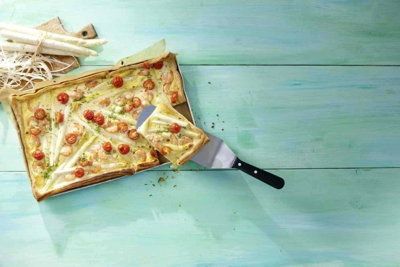 Wer kennt es nicht, in regelmäßigen Abständen überkommt auch den Feinschmecker die kulinarische Lust auf Pizza. Wie gut, dass sich dieses italienische Nationalgericht auch perfekt mit Spargel, Kirschtomaten, Garnelen, Mozzarella und Ricotta kombinieren lässt. Wer keine Meeresfrüchte mag, kann die Garnelen selbstverständlich auch weglassen.