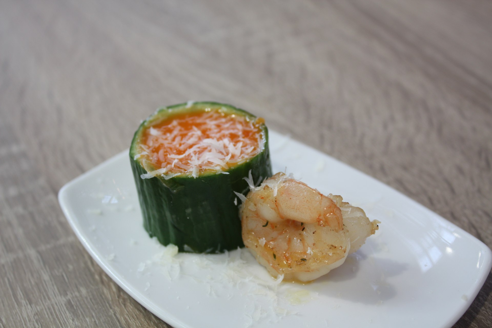 Die Garnelen mit Salz, Limonensaft und Chiliöl marinieren und kurz von beiden Seiten in der Grillpfanne anbraten. Anschließend an einer Seite von der Gurke dekorativ platzieren und mit Thymian fein dekorieren.